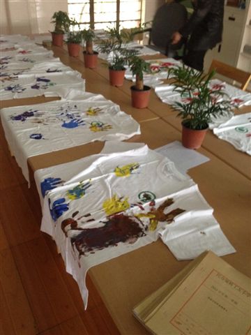 体恤上按手印有人名、太阳,动物、花朵;T恤颜料是张成记者网购送来的。